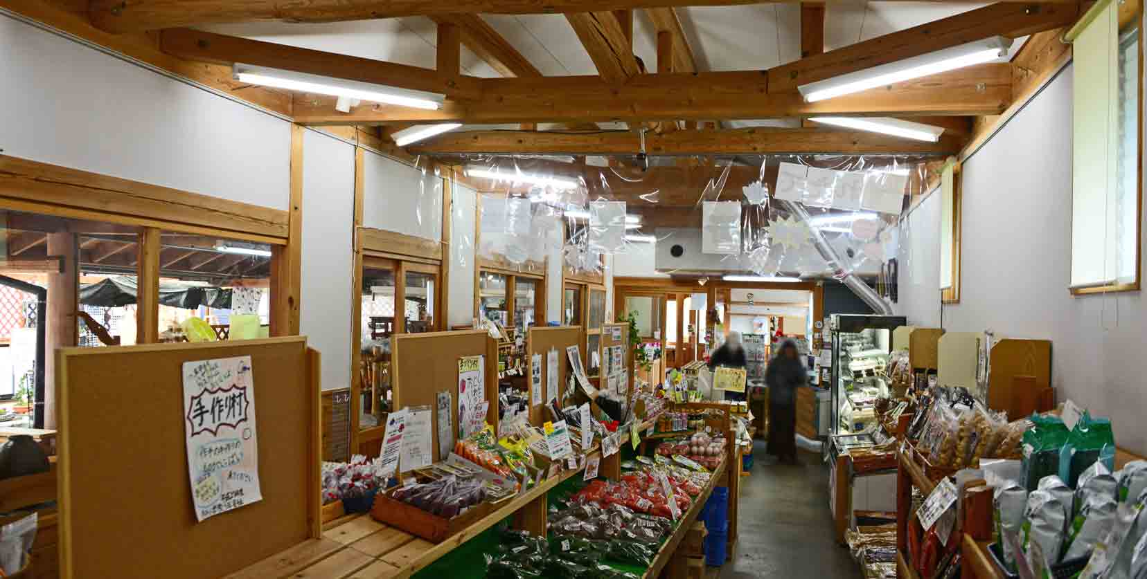 ◆ 売店(9:00〜18:00):山村と都市の交流拠点として市内で採れる農林産物とそれらの加工品を販売しています。作手の産直野菜やトマトジュース、トマト寒天、トマトソフトなどがあります。売店の建物にプレハブ小屋が付設されていて、その中には手作りの木工品やクラフトなどがあります。また敷地内に美川フランク屋、五平餅屋もあります。