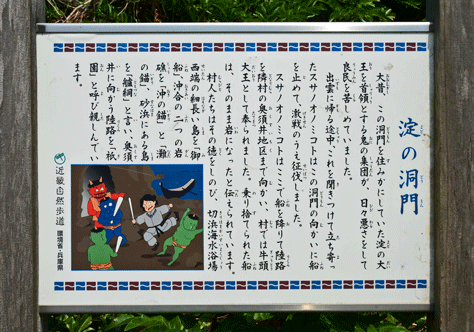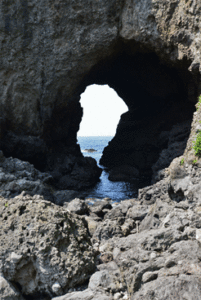 最新投稿・観光名所・旧跡 淀の洞門 道の駅「あまるべ」から京都に向かう山陰海岸国立公園竹野海岸沿いにある海食洞です。大昔に大鬼が金棒で穴を開け根城にした鬼集団をスサノオが退治したという伝説が残っています。洞門のすぐ側まで徒歩で行って見ることができます。海岸沿いを車で走っていると突然半島に大きな穴が空いている姿に驚かされます。 ◆ アクセス:道の駅「あまるべ」から日本海沿岸を舞鶴方面に約26km (兵庫県)豊岡市竹野町切濱1121