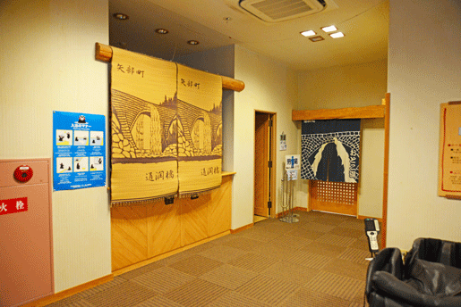 道の駅「通潤橋」から通潤橋を見て右手山の上に国民宿舎「通潤山荘」があります。宿舎の中に日帰り入浴もできる「浜の湯温泉」があります。山の中で大自然に囲まれたやすらぎの温泉です。大浴場、露天風呂、サウナがあります。