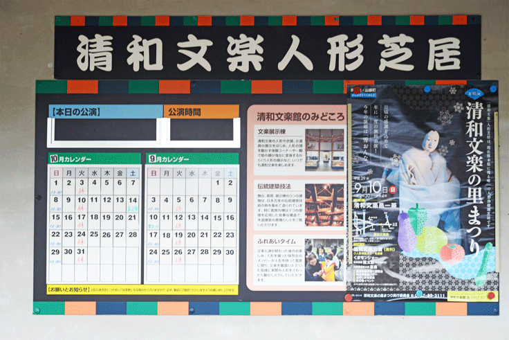 ◆ 清和文楽館:営業時間(9:00〜16:30)<火曜日定休日>、資料館見学:高校生以上500円、小・中学生300円、本公演鑑賞料:高校生以上1,800円、中学生以下1,200円、ミニ公演鑑賞料(30分):高校生以上1,500円、中学生以下1,000円(平成29年4月改正)