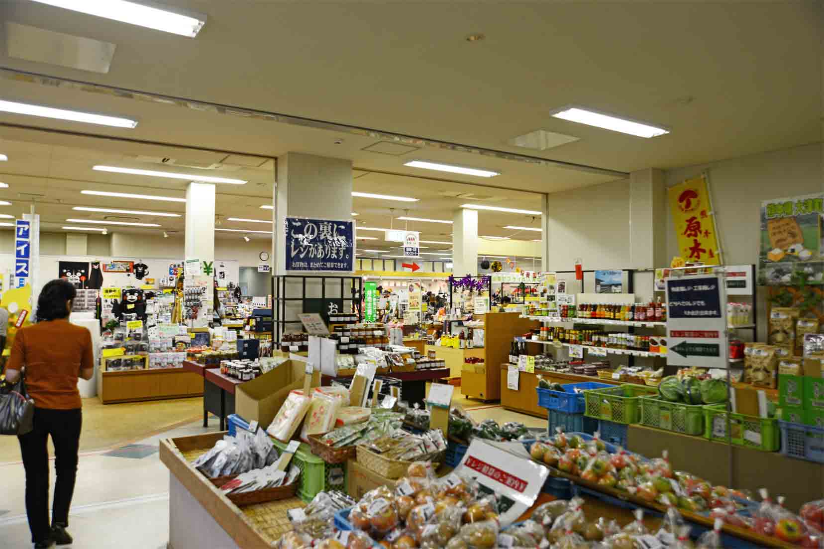大分県犬飼へ向かう国道57号と「阿蘇山の北外輪山の上を走るミルクロードとの分岐点である「あその玄関口」大津町にあります。この道の駅は物産館と別に日用品や婦人服などが揃う「工芸館」があります。