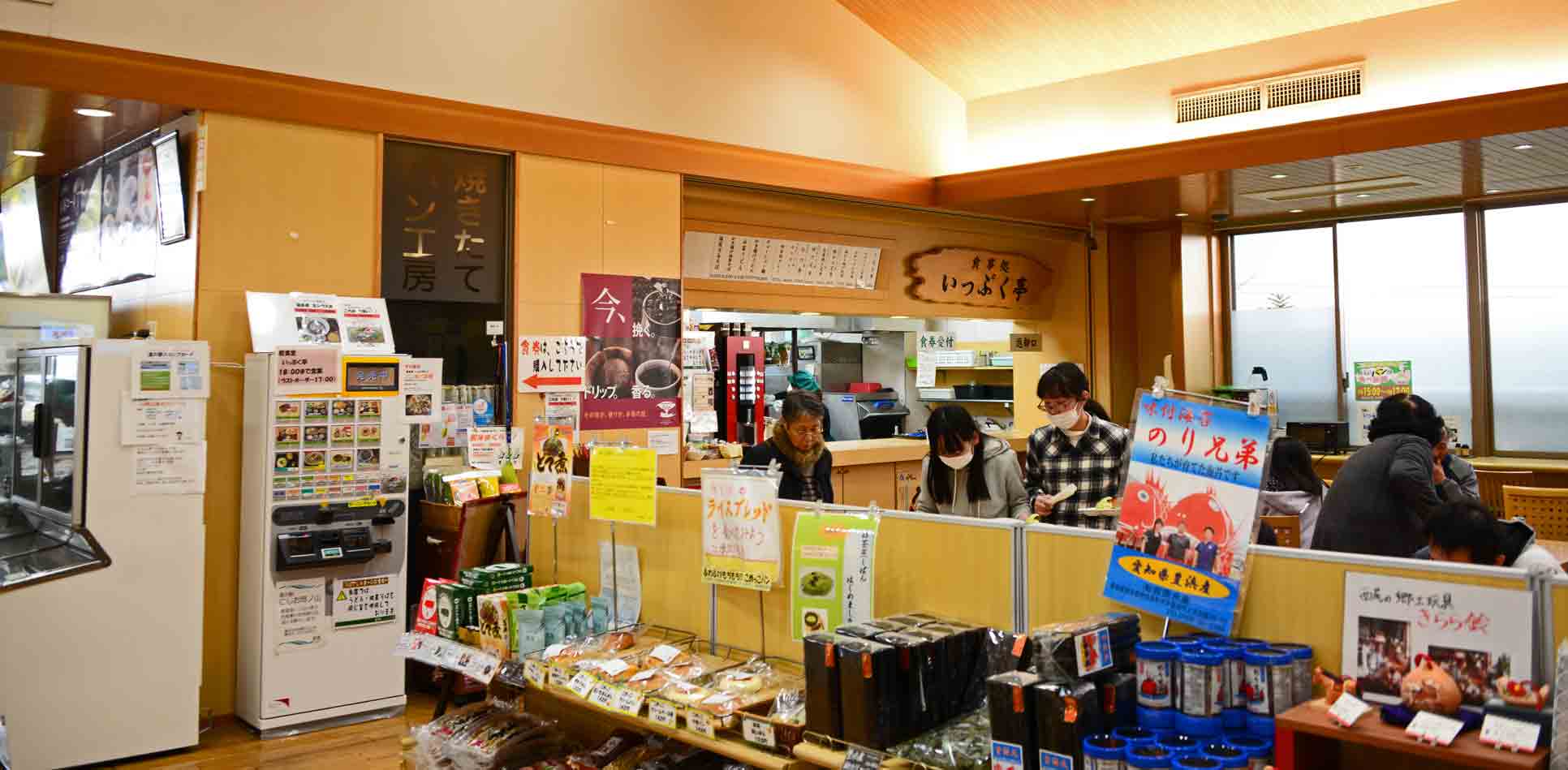 ◆ 売店(9:00〜18:00):地元野菜や西尾の抹茶、えびせんべいなど特産品を販売しています。その他、コンビニエンスストア(6:00〜22:00)が同じ建物内にあります。